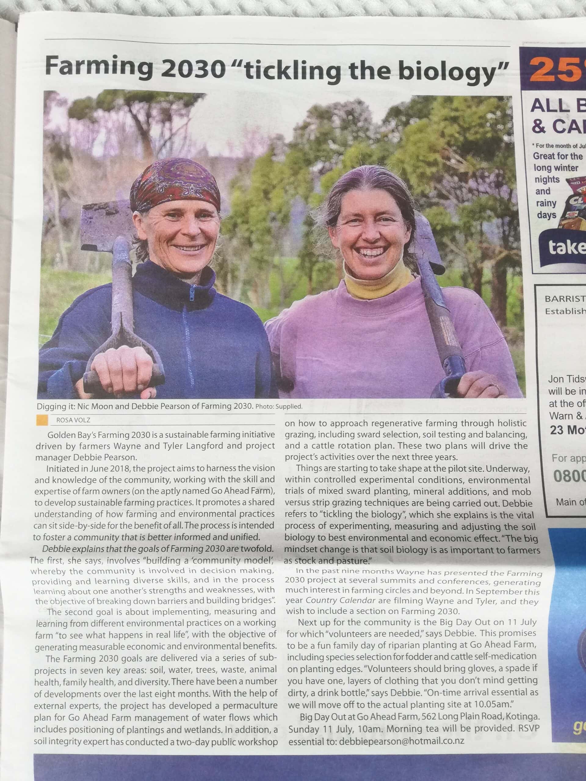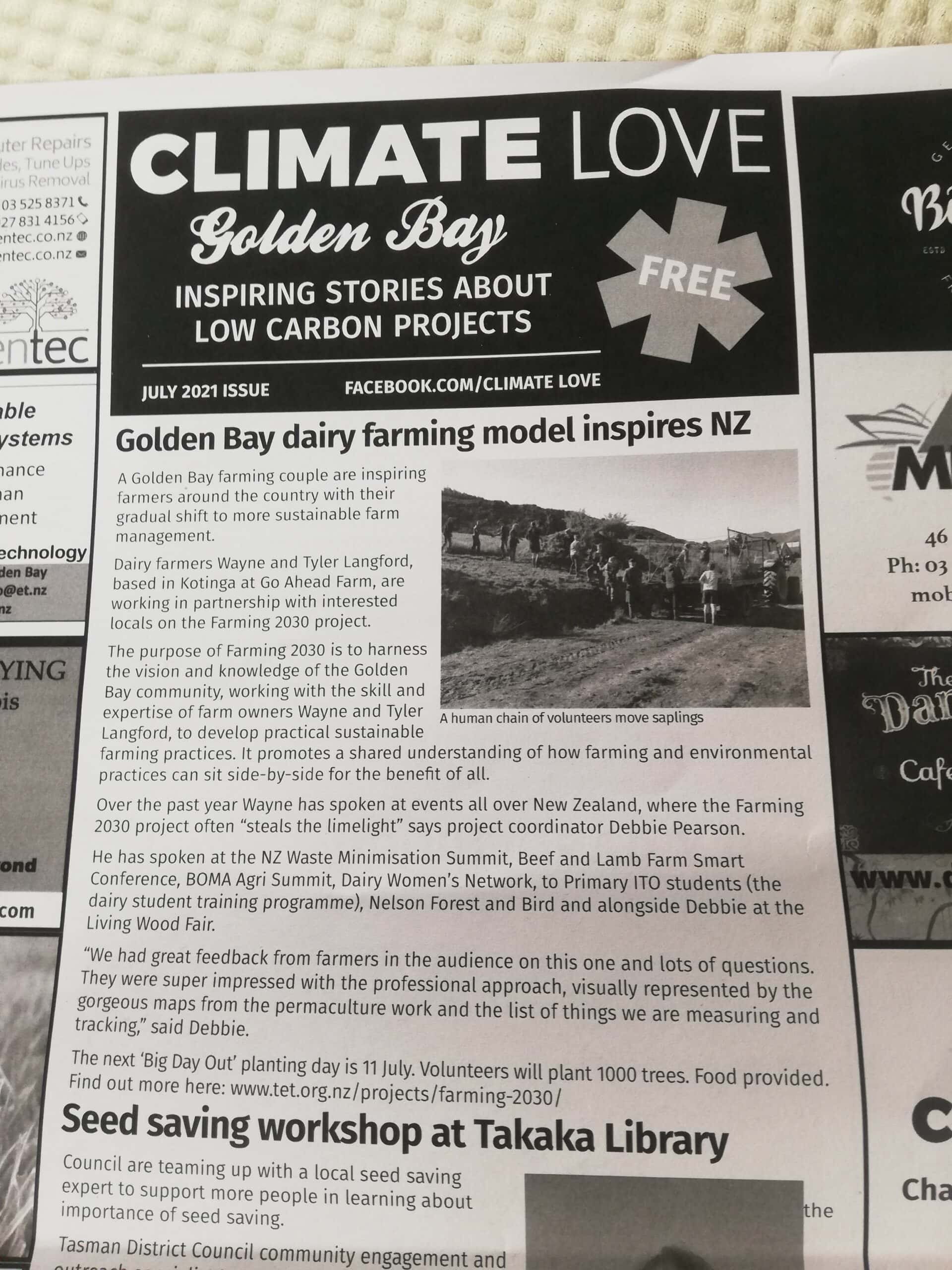 Farming 2030 harnesses the vision and knowledge of the Golden Bay community, working with the skill and expertise of farm owners Wayne and Tyler Langford, to develop practical sustainable farming practices. It promotes a shared understanding of how farming and environmental practices can sit side-by-side for the benefit of all. In the process it fosters a community that is better informed and unified.