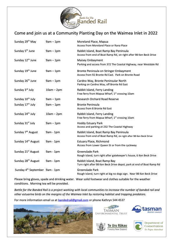 And Battle for the Banded Rail, always supremely well-organised, has published all its Waimeha/Waimea Inlet planting dates for the entire season. Check it out: