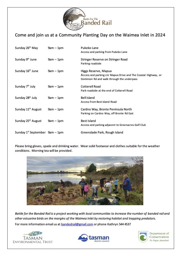 Battle for the Banded Rail is a community conservation project supported by the Tasman Environmental Trust. Since 2015 the project has trapped 10,900 pests and planted 164,000 plants in the Waimea Inlet – half of these were planted by community volunteers.