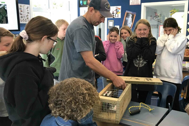 He kicks off with a PowerPoint presentation. Most of the students seem to have at least heard of whio; Farmers for Whio is their community’s initiative, after all. But when it comes to question time, it’s the predators who are the stars. Do stoats eat other stoats? If a feral cat and a stoat were in a fight, which one would win? Before it all goes too far down the Alien Vs. Predator route, Barry brings out a demonstration trap.