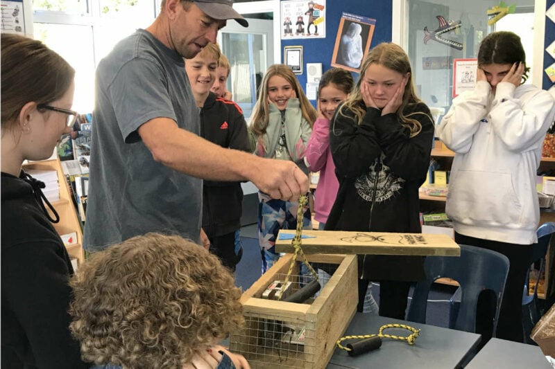 During Whio Awareness Month, Farmers for Whio representative Barry Burger visited Ngatimoti School in Tasman to give students hands-on experience with building predator traps. We sent our reporter along for a look.