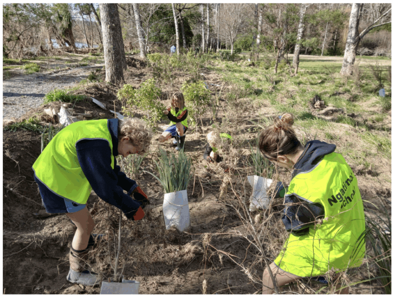 Volunteers from Ngātimoti School breathe new life into silt laden plants.